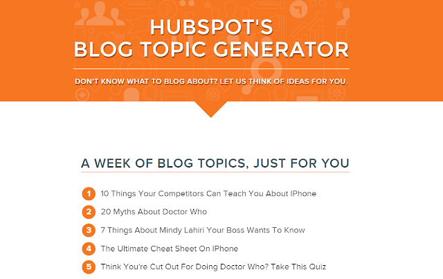 Sometime you write a good article for your blog but eye catching title is hard to make it, than Hubspot Blog help you to create a best Title for you. For example in this research i have find out “iPhone”, “Doctor Who”, and “Mindy Lahiri” , the expected topic suggested by the Hubspot are as under